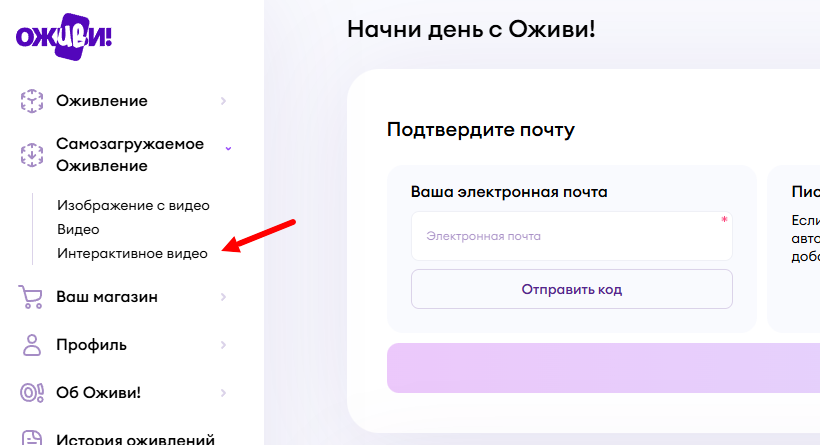 1. Зайдите в свой аккаунт, на главной странице нажмите Самозагружаемое Оживление и выберите "Интерактивное видео"